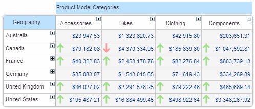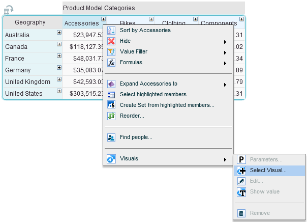 To apply infographics to the cells of a column or row in the grid, select Infographics > Select Infographics from the relevant member menu. Or, click on the member and click Rows/Columns