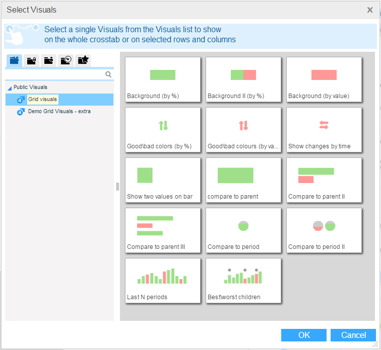 1. To apply infographics to all the cells, select the view. Then, on the Visuals tab of the ribbon, click Grid