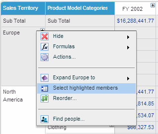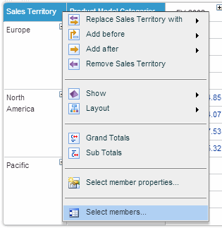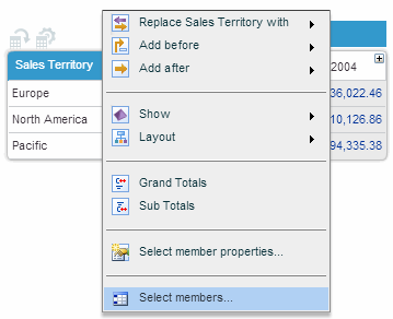 1.Click on the dimension heading and select Select members from the dimension menu.