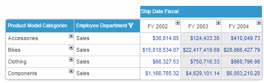 The grid and chart now display only the selected members. A filter icon appears in the heading of the member’s dimension indicating that a member selection has been performed in that dimension.