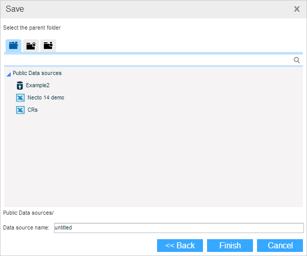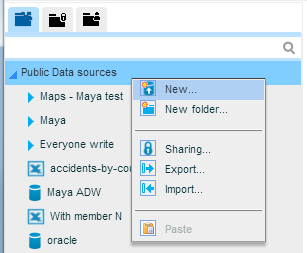 Data sources are organized in a tree structure (like files and folders). You can place them in the public folder, available for all, or in a private folder for personal use.