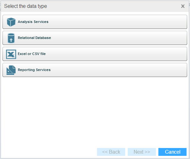 2.In the Select the data type dialog box, select: Analysis Services Data Source, Relational Database Data Source, Excel or CSV Data Source, or Reporting Services Data Source.