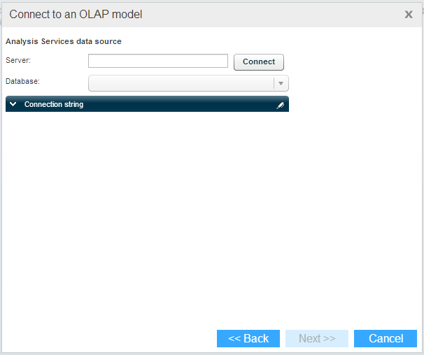When you choose Analysis Services as the data source, you need to create a connection to an Analysis Server cube by configuring the following settings.