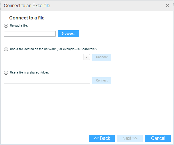 To use a file in a network like SharePoint, select the Use a File in a Network option. Specify the file’s path and click Connect.