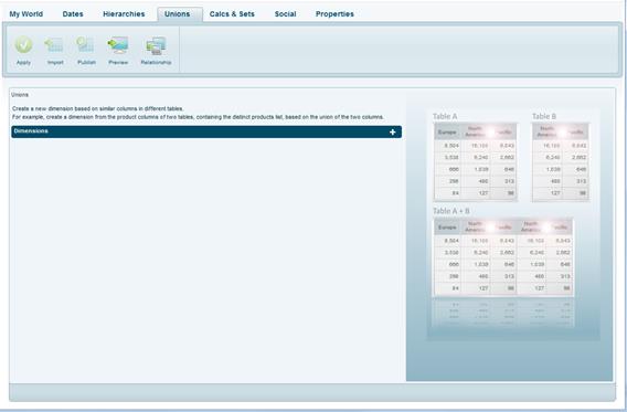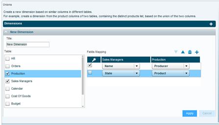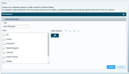 Via the Union tab, you can create a new dimension based on many-to-many relationships between the columns of different tables. You can use this option to create a dimension, for example, by unifying the product columns of two tables.