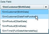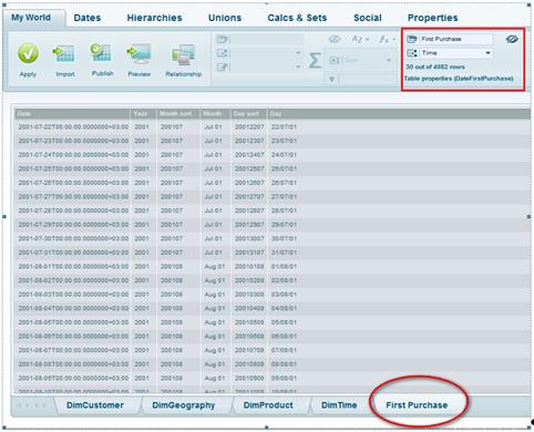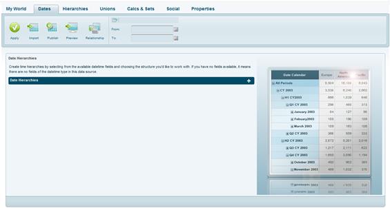 Click the Dates tab to define date and time hierarchies. This tab will show the table columns from My World that are of datetime type. If no columns display in this section, it means there are no datetime fields in the tables imported from the data source.