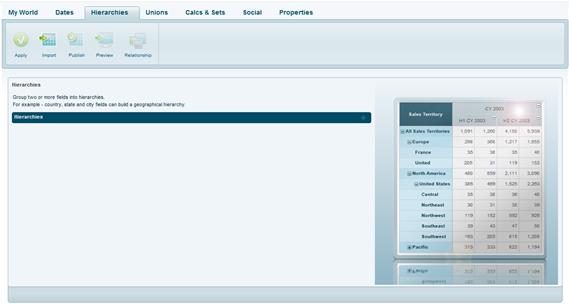 In the Hierarchies tab, you group various columns into a customized hierarchical structure. For example, you may want to build a product hierarchy using the Product Category, Sub-category and Product Name columns, and create a geographic hierarchy based on the State, Country and City columns. You can define as many hierarchies as you want and reuse columns from one hierarchy when building another one.