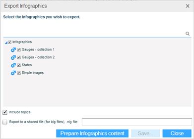 2. The upper part of the Export Infographics dialog box displays the tree of the items. To export a specific folder or family, deselect the irrelevant items. Selecting/deselecting a parent item selects/deselects the descendant items.