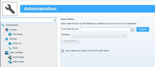 4. Select the Auto Create New Users from OLAP Role’s Users check box in order to automatically create user records in Necto for the users assigned to the imported OLAP roles.