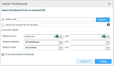 4. If you want the imported workboard(s) to have different connection details, in Replace Server, Replace Database and Replace Model, select the data source, database and cube you want to replace. In the with fields select the new server, database and model for the imported workboard(s).
