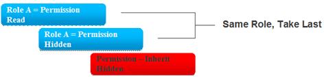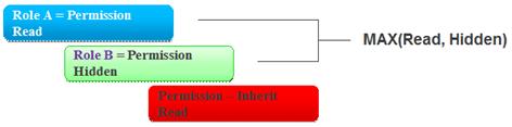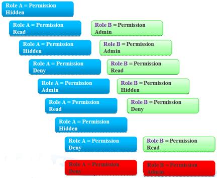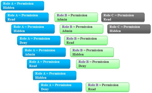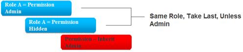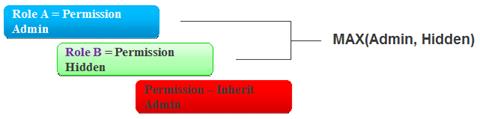 § Rule 2 is applied: Combining hierarchies and selecting the stronger permission. In the following example, Admin is applied since it is stronger than Deny.