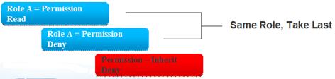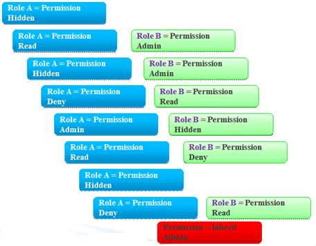 § Rule 1 is applied: Use last folder permission unless root permission is Admin. In the following example, Deny is taken for Role A and Admin for Role B.