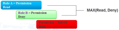 There are three roles, Role A, Role B and Role C, each having different permissions at different levels of the hierarchy. A user has two roles, Role A and Role B. At the lowest level of the hierarchy, this user has both Deny (Role A) and Read (Role B) permissions. The user’s access rights to the next lower level is determined as follows: