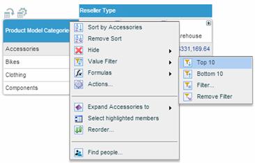 in the member heading, and from the member menu select Value Filter > Top 10 or Bottom 10.