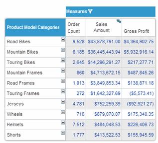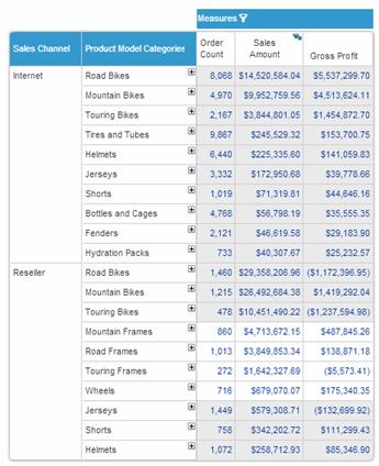 In the following example, Product Model Categories is nested after Sales Channel and both dimensions are in flat layout. The example illustrates how Top-10 ranking has been performed for the entire grid when there are nested dimensions. To achieve this all nested dimensions must be in Flat layout.