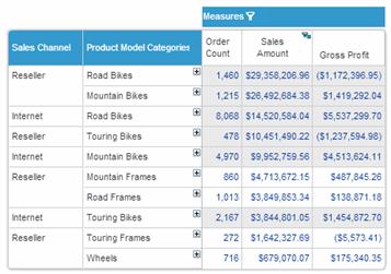 In the following example, the Product Model Categories dimension (expanded to Subcategory level) is nested after Sales Channel. In this case, ranking does not remove the nesting but applies the filter to each parent. The result is Top 10 for Internet and Top 10 for Reseller.