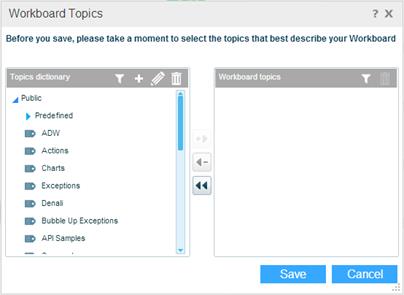 If no topics have previously been associated with this workboard, the Workboard Topics dialog box opens for tagging the workboard with new or existing topics that best describe your content.