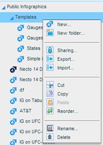 You can use the Cut, Copy, Paste, Reorder, Rename and Delete options from the options menu in the Infographics Pane in the same way as for folders and workboards in the Workboards Pane.