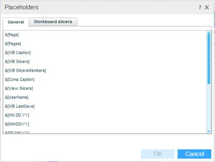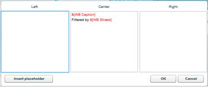 By default, the workboard caption and workboard slicers placeholders appear in the center section: &[WB Caption] Filtered by &[WB Slicers].