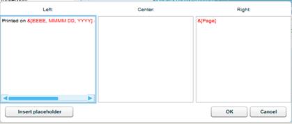 In the same way as for the header, define the elements to display in the three sections of the footer. By default, the page number placeholder appears in the right section: &[Page], and the day, date and time placeholders in the left section: Printed on &[EEEE, MMMM DD, YYYY] at &[Time_24].