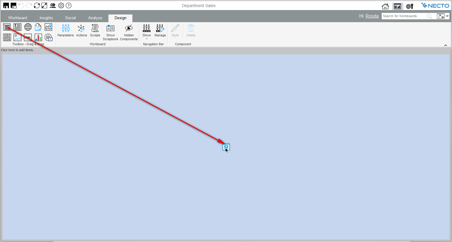 · On a blank workboard canvas: To position the first component on a blank workboard canvas, drop the icon at the center. The component will cover the entire canvas.