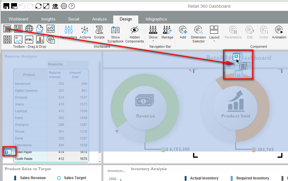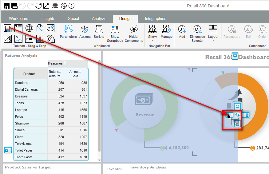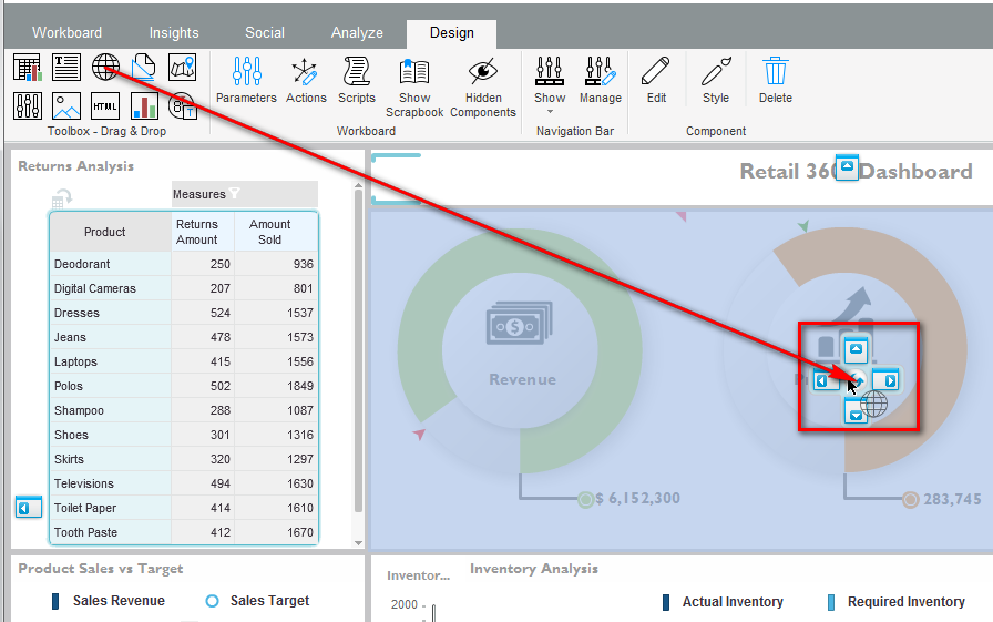 · Replace a component: To replace a component on the workboard with the new component, drag the icon to that component and drop it on the target indicator at the center.