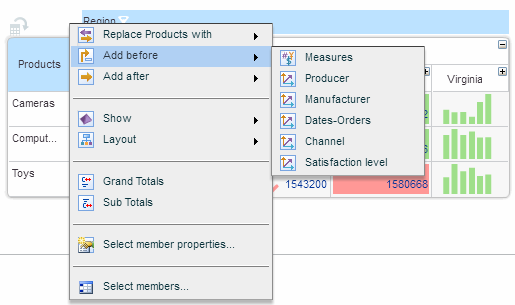 You can also click in the heading of the dimension, from the dimension menu select Add before or Add after, and from the list of dimensions choose the dimension to add.