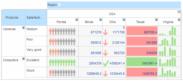 The following example shows how the Satisfaction Level dimension is nested after the Products dimension.