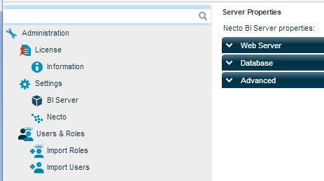 The Settings > BI Server option is used to define and modify the Necto BI server properties.