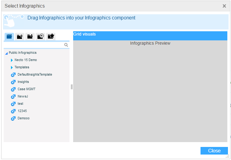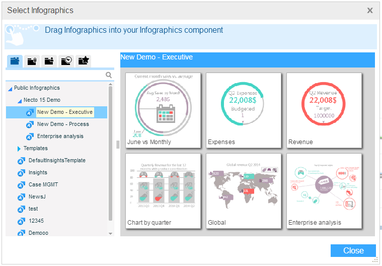 Drag and drop the entities you want into the infographics component. Click Close to close the dialog box.