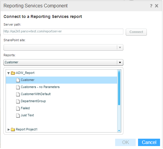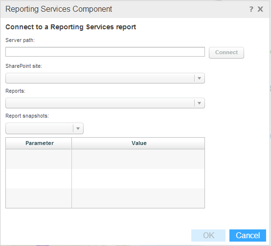 When you drag the Reporting Services Component icon from the Toolbox on the Design tab of the ribbon to the desired area on the workboard, the Reporting Services Component dialog box opens for connecting to a server and choosing the report. This dialog box is also activated by clicking the Edit