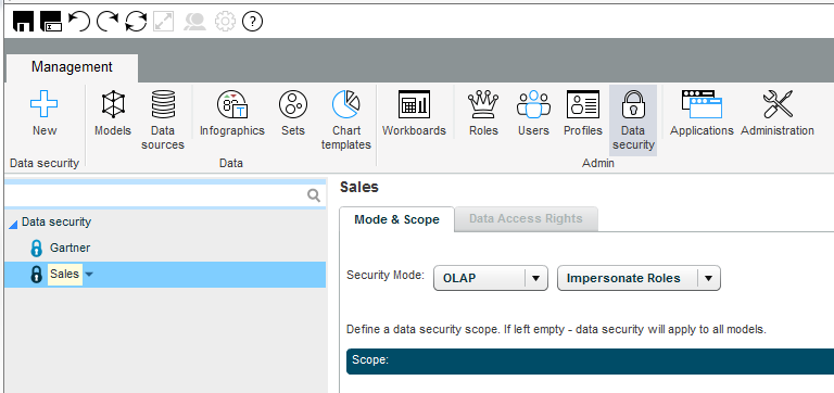 3. Define the security mode and scope in the Mode & Scope tab and the Data Access Rights in the Data Access Rights tab.