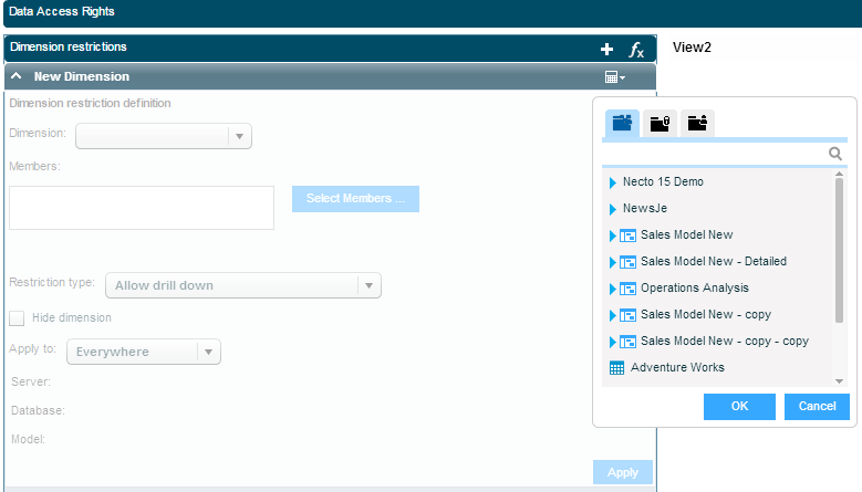 Here you can define restrictions at the level of a dimension in a view. The restriction can be set for the entire dimension or for selected members.