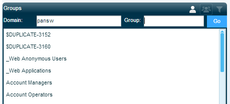 5. To import roles from the organization’s domain, click on the Available Users panel. Enter the Domain name. If you know the name of a group, enter it in Group. Click Go. The groups in the specified domain display. Add the relevant groups to the role.