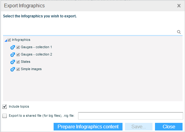 2. The upper part of the Export Infographics dialog box displays the tree of the items. To export a specific folder or family, deselect the irrelevant items. Selecting/deselecting a parent item selects/deselects the descendant items.