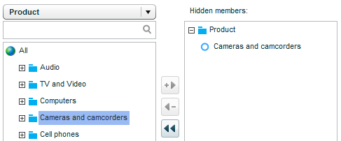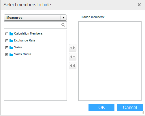 From the dimensions dropdown list in the Select Members to Hide dialog box, select the dimension. Then, move the members to hide to the Hidden Members panel. Click OK.