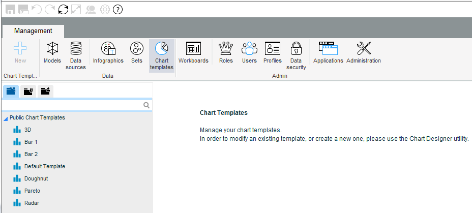 The Charts option on the Management page ribbon is used to view the chart templates defined in Necto, organize them in folders, and perform various management functions.