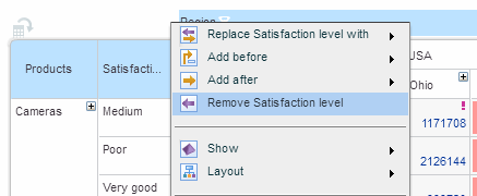 Click Remove on the Dimension tab of the ribbon. Or, click in the heading of the dimension you want to remove, and select Remove <dimension name>.