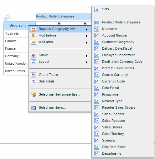 Or, click in the heading of the dimension, from the dimension menu select Replace <dimension name> with, and from the list of dimensions choose the new dimension.