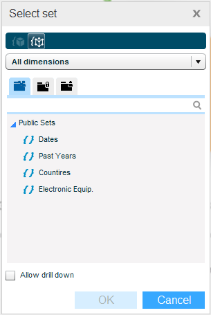 A dimension may have OLAP sets defined for it in the data cube or model. It may also have public and private sets defined for it in Necto. A set is a member selection filter. Sets defined for a dimension are available for selection in the list of dimensions.