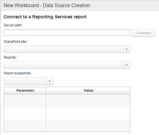 When you choose Reporting Services as the data source, the next step of the wizard displays as illustrated in the following figure.