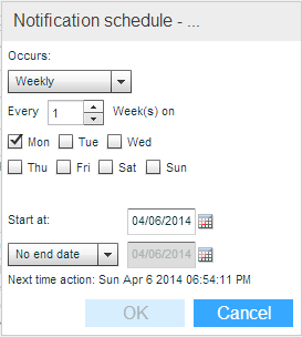 Select the relevant occurrence entries. For example, to send the notification every Monday, select Weekly and Mon, and set the Start date.