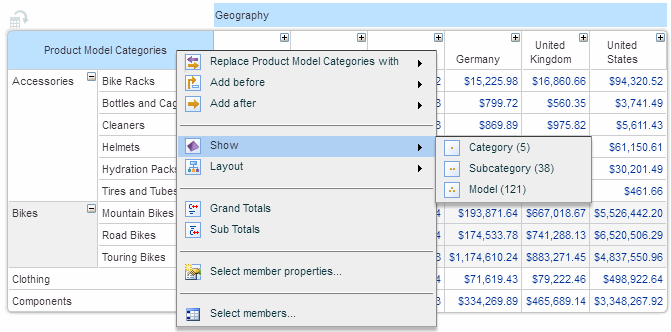 While drilling up and down a member enables you to expand and collapse one member at a time, the Show option allows you to expand or collapse the entire dimension to a specific level with a single click.