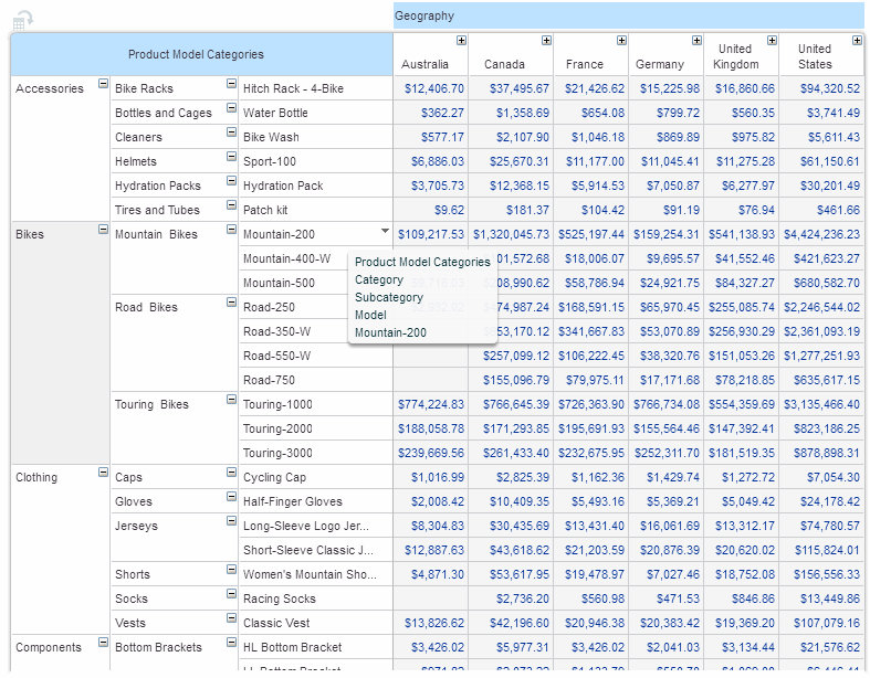 The example below shows the Product Model Categories dimension drilled down to the Model level.