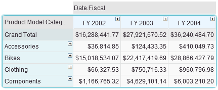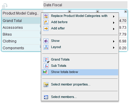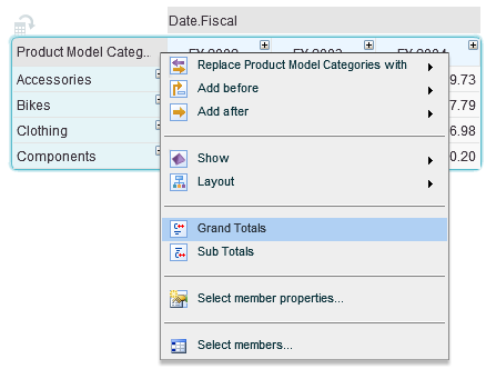 In the following example, grand totals are displayed for the Product Model Categories dimension.