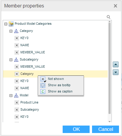 To show the property as a caption, select Show as caption. The property value will replace the member caption in the grid.