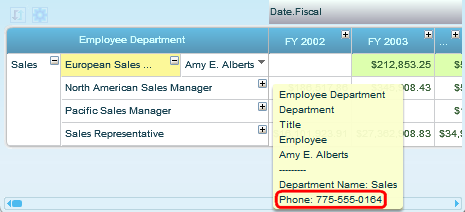 The Not Shown option is selected by default. To show the property in the member tooltip, select Show as tooltip. In the following example, the property “employee phone number” has been selected to show in the tooltip: