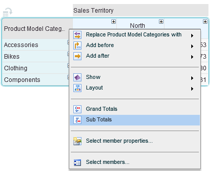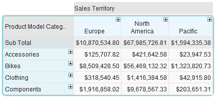 In the following example, subtotals are displayed for the Sales Territory and the Product Model Categories dimensions.