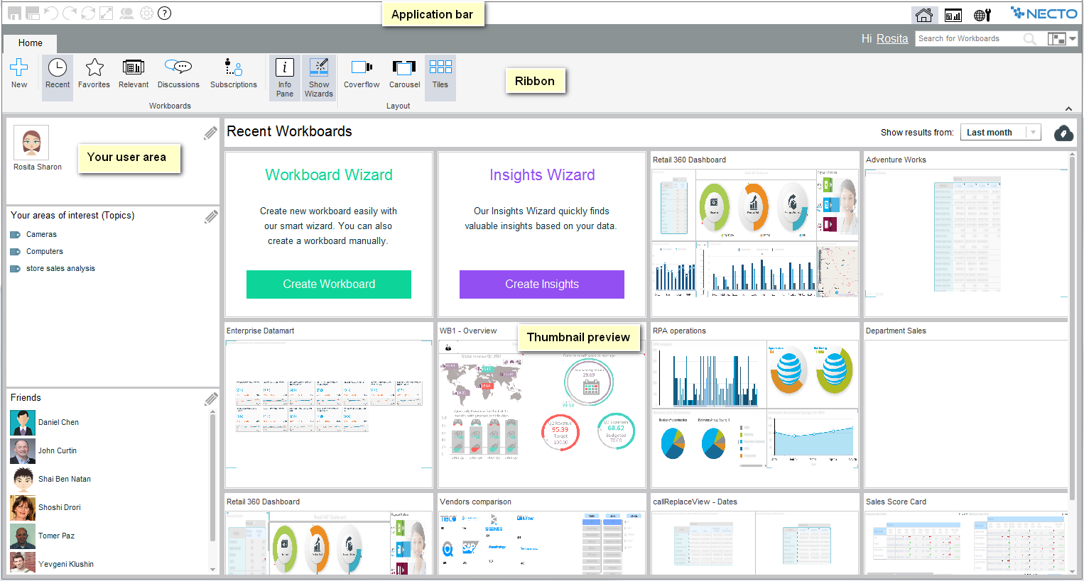 The Necto Home page contains the following areas: Application Bar, Ribbon, Thumbnail Previews, and your user area.