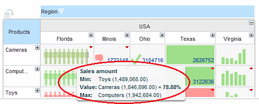 A tooltip appears when the mouse pointer hovers over an item on the workboard page, as well as on other pages. For items such as dimensions, members and exception indicators, the tooltips contain extended information.